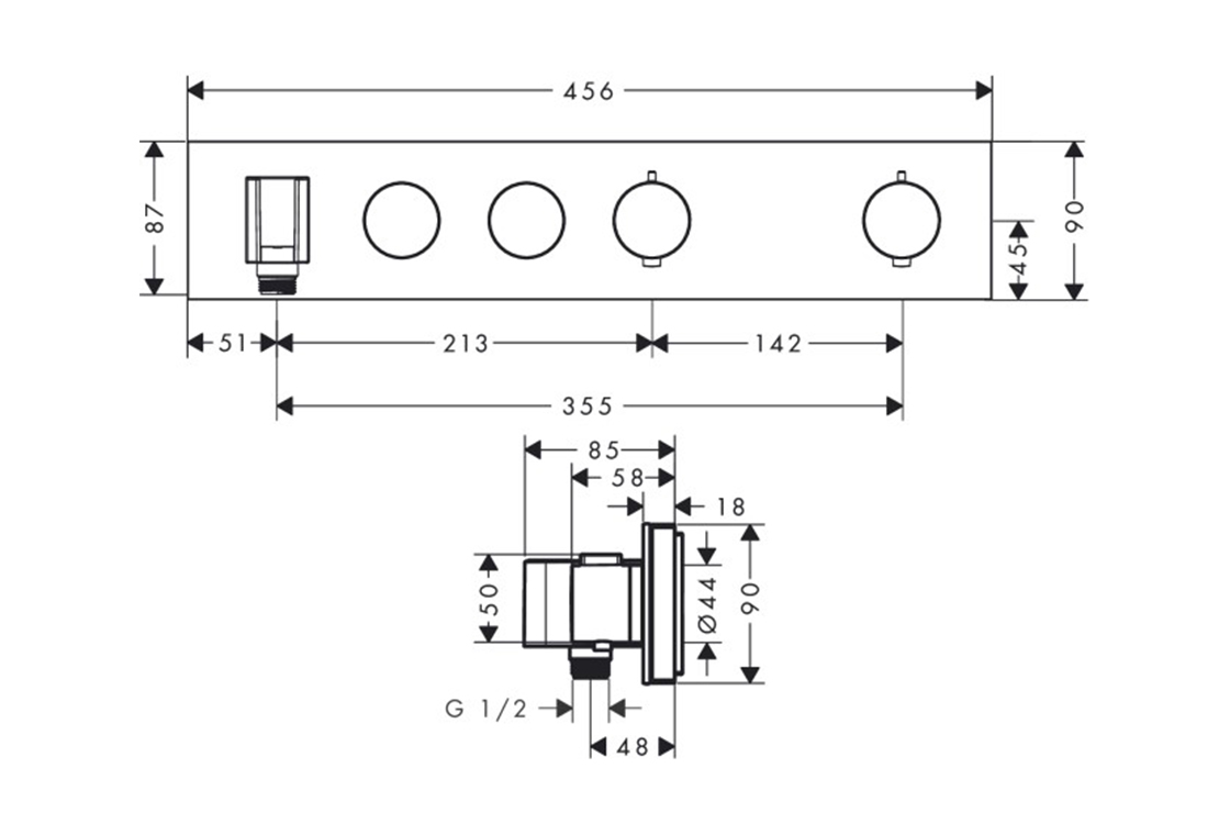 складається з: термостата на 2 споживача, тримача для душу2 функції;картридж термостата, пусковий/запірний клапан для роботи функцій;зменшення витрати води на 50% залежно від встановлення, а також вбудована функція відключення;вибіркове кнопкове керування для 2-ох режимів;одночасне використання декількох режимів;максимальна витрата при 3 барах: 26 л/хв;макс. робочий тиск: 10 бар;безпечна зупинка при 40 °C;регулюється обмеження температури;для душових шлангів з конусною гайкою;термостат поставляється з кнопками Rain large і ручним душем;тип підключення: базовий комплект;необхідне додаткове обладнання: прихована частина для змішувача зі стіни Select на 2 функції (арт.18310180) (не входить в комплект).