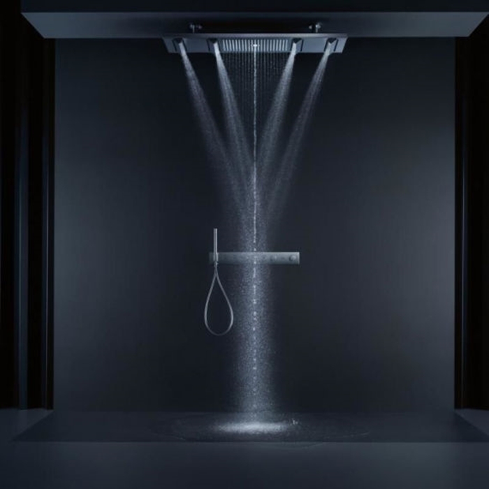 складається з: термостатичного модуля, тримача для душу,5 функцій,термостат поставляється з ручним душем з кнопками, Mono, PowderRain всередині, PowderRain зовні, верхній душ,максимальна витрата при 3 барах: 26 л/хв,необхідне додаткове обладнання: прихована частина для змішувача зі стіни Select на 5 функцій (арт.18313180).