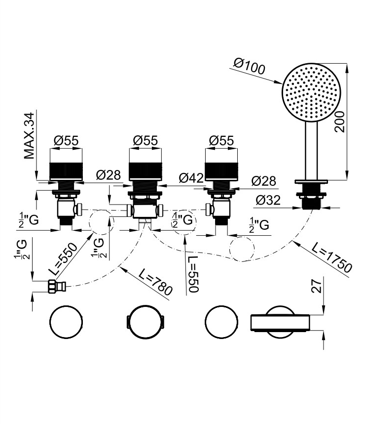 TONO Комплект змішувача на бортик ванни на 4 отвори (клапани, перемикач, ручний душ, тримач) (100190247)