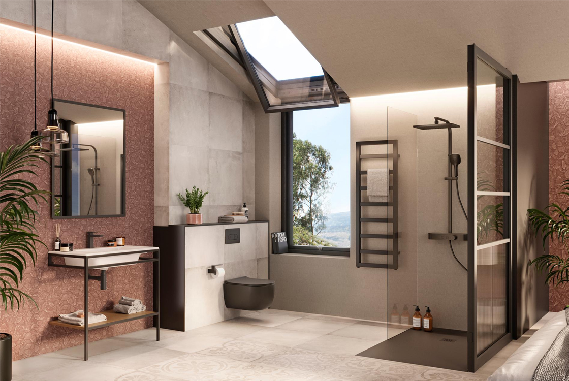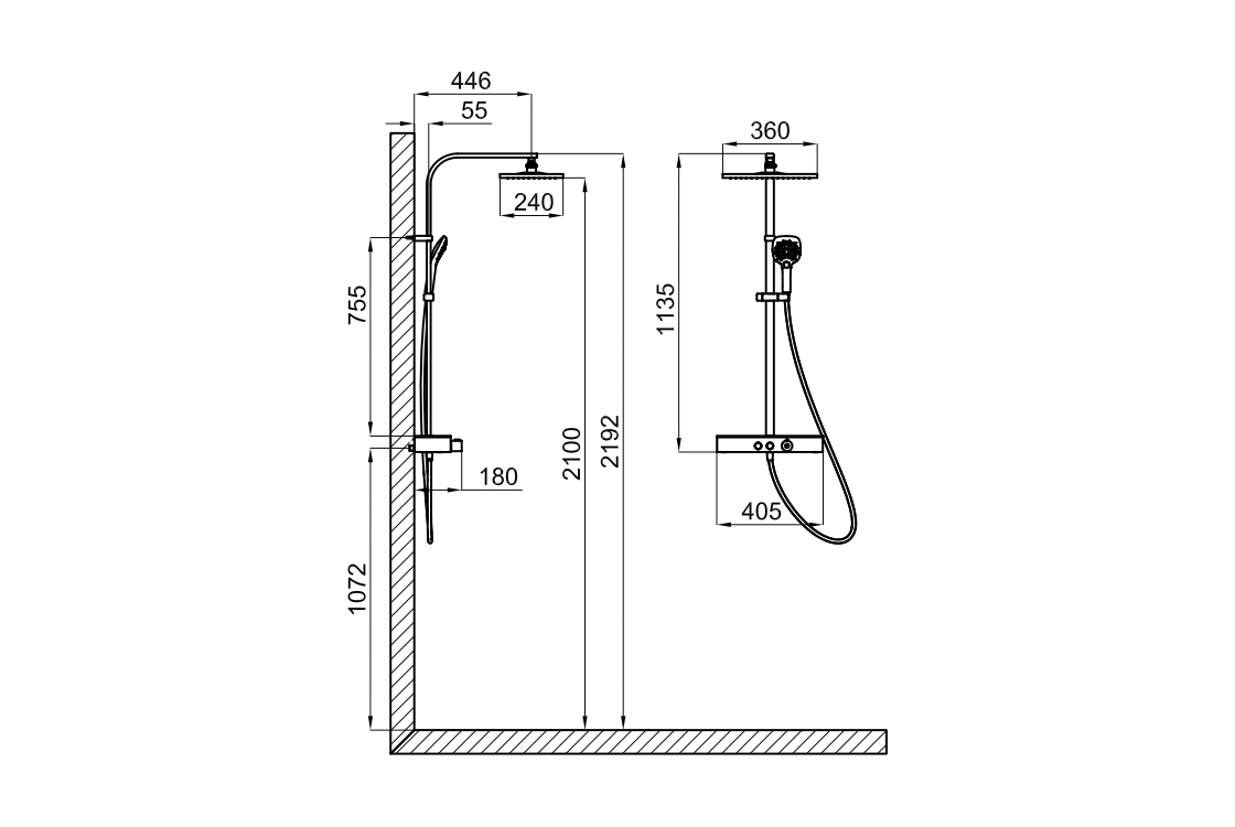 Душова система складається із: змішувача з термостатом, верхнього душу, ручного душу, штанги для ручного душу зі слайдером, шланга, скляної полиціз'єднання 1/2" і відстань між ними 150 мм,максимальна витрата води при 3 барах: ручний душ 7 л/хв, верхній душ 9,15 л/хв
