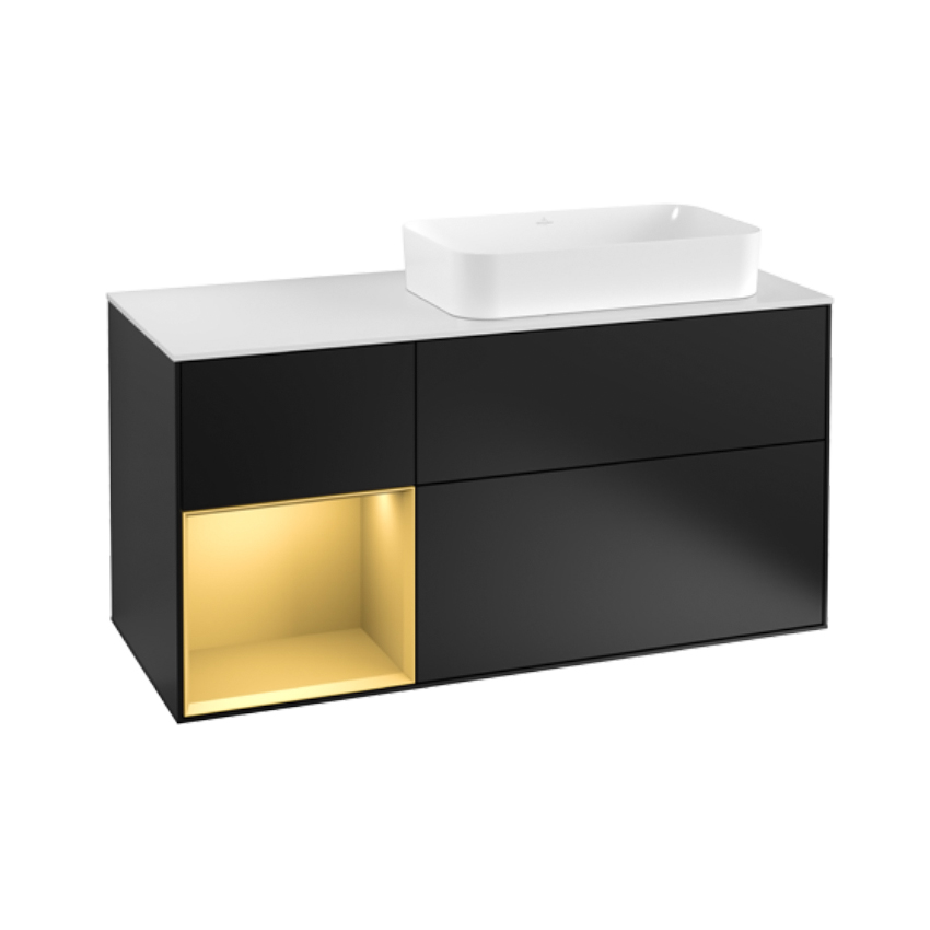 Тумба під раковину Villeroy & Boch Finion (F271HFPD) з 3 висувними відділеннями з протиковзким килимком і з LED-підсвіткою (1x LED / 2,3Вт. A-A ++. 2700K нейтральний білий / 6480K білий денне світло). Одна відкрита полиця. Є отвір для змішувача. Раковина встановлюється праворуч.