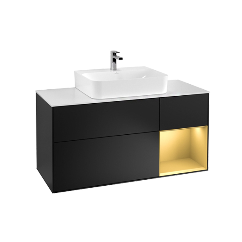 Тумба під раковину Villeroy & Boch Finion (G171HFPD) з 3 висувними відділеннями з протиковзким килимком і з LED-підсвіткою (1x LED / 2,3Вт. 2x LED / 4,2Вт. A-A ++. 2700K нейтральний білий / 6480K білий денне світло) . Одна відкрита полиця. Раковина встановлюється по центру.