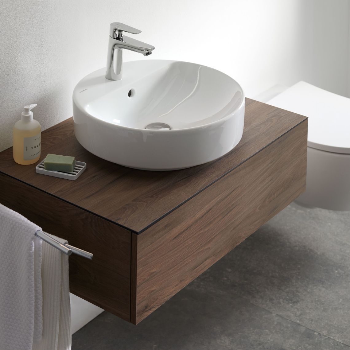 Тумбочка для накладного умивальника Geberit VariForm, з одним висувним ящиком, полицею та сифоном: 75 см, горіх (501.162.00.1) – зручна сантехніка на кожен день.