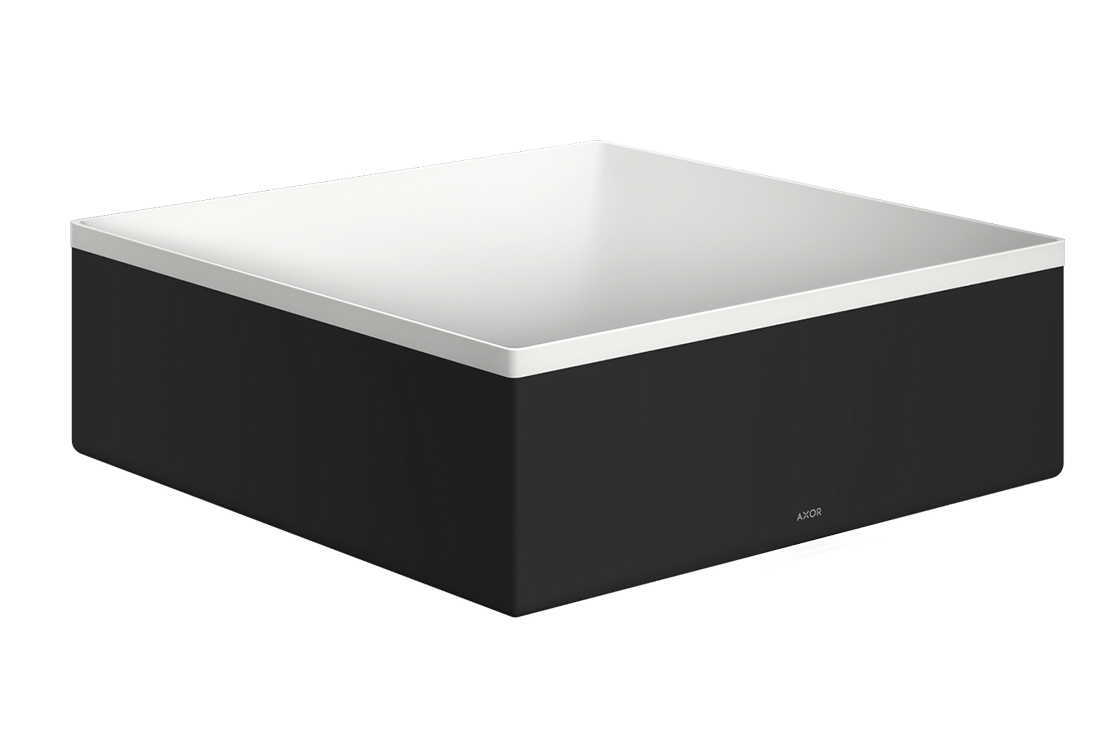 Умивальники AXOR Suite квадратної форми від всесвітньо відомого дизайнера Філіпа Старка, привнесуть гармонію та індивідуальність у будь-який інтер'єр ванної кімнати. Виготовлені з міцного й довговічного матеріалу SolidSurface, вони мають гладкі контури та «м’яку» внутрішню поверхню, позбавлену швів. Зовнішнє металеве кільце у різних відтінках навколо умивальника забезпечує чистий сучасний вигляд і універсальну привабливість.умивальник білого кольору з металевим кільцем в кольорі Matt Black,без отвору під змішувач, без переливу