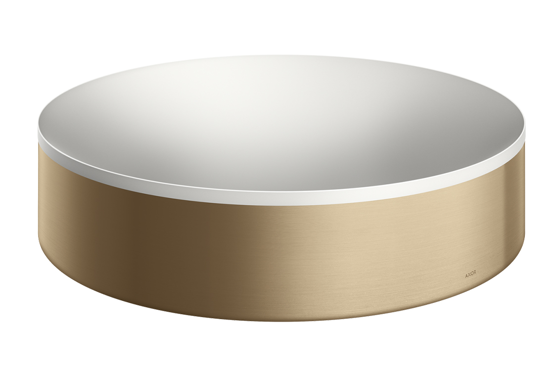 Круглі умивальники AXOR Suite від всесвітньо відомого дизайнера Філіпа Старка, привнесуть гармонію та індивідуальність у будь-який інтер'єр ванної кімнати. Виготовлені з міцного й довговічного матеріалу SolidSurface, вони мають гладкі контури, невеликі радіуси та «м’яку» внутрішню поверхню, позбавлену ліній або швів. Зовнішнє металеве кільце у різних відтінках навколо умивальника забезпечує чистий сучасний вигляд і універсальну привабливість.умивальник білого кольору з металевим кільцем в кольорі Brushed Bronze,без отвору під змішувач, без переливу