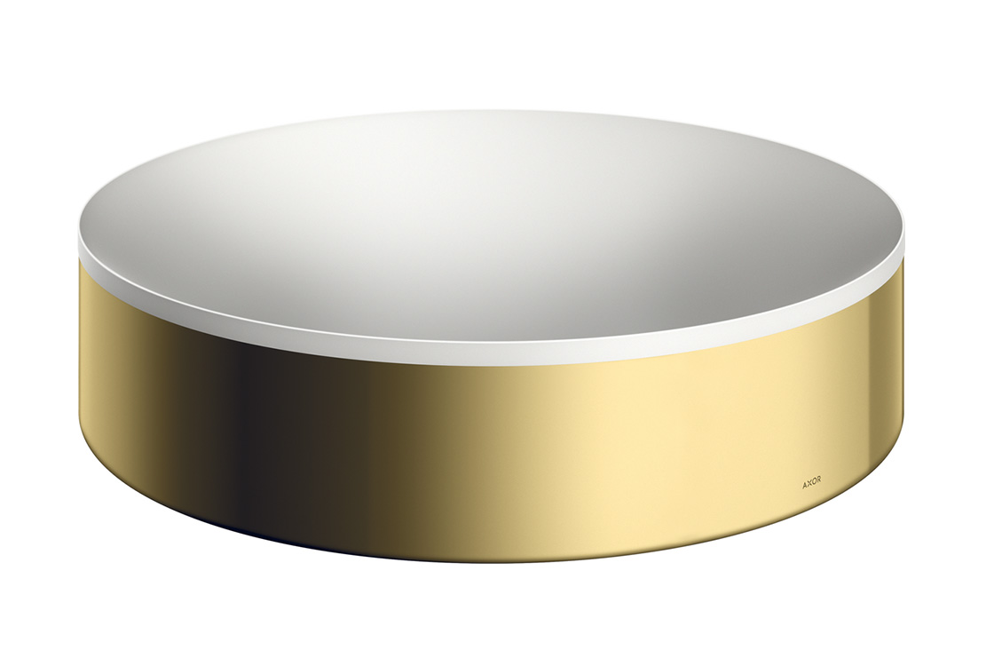Круглі умивальники AXOR Suite від всесвітньо відомого дизайнера Філіпа Старка, привнесуть гармонію та індивідуальність у будь-який інтер'єр ванної кімнати. Виготовлені з міцного й довговічного матеріалу SolidSurface, вони мають гладкі контури, невеликі радіуси та «м’яку» внутрішню поверхню, позбавлену ліній або швів. Зовнішнє металеве кільце у різних відтінках навколо умивальника забезпечує чистий сучасний вигляд і універсальну привабливість.умивальник білого кольору з металевим кільцем в кольорі Polished Gold Optic;без отвору під змішувач, без переливу;внутрішня висота: 80 мм;без донного клапана
