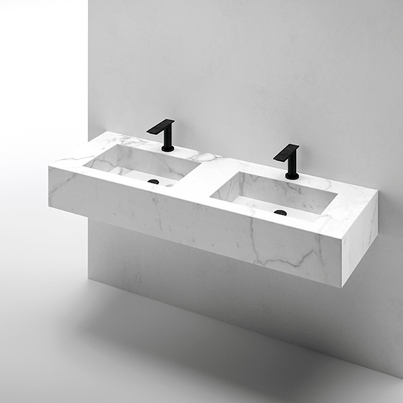 Умивальник підвісний з керамограніта WaterStone 150х50 (WS21500) без переливу довжиною 150 см. Виробляється під замовлення з керамогранитной плити Graniti Fiandre, Atlas Concorde або Florim в обраному кольорі. Може комплектуватися додатковою вставкою (подвійним дном) з керамограніта, яка закриває донний клапан, створює ухил і щілинний слив. При необхідності вирізаються отвори під змішувач в потрібній кількості.