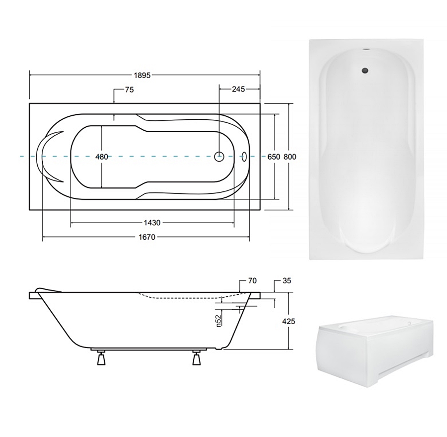 Дно ванни має 4 ребра жорсткості і додатково укріплене плитою ДСП, 18 мм завтовшки.Акрил, товщиною по борту 4-5 мм з потовщенням по дну 6-8 мм, витримує навантаження 300 - 350 кг.Ванна "BONA" важить всього лише 23 кг, об’ємна вага - 152 л. Ванна «BONA» додатково комплектується ніжками.