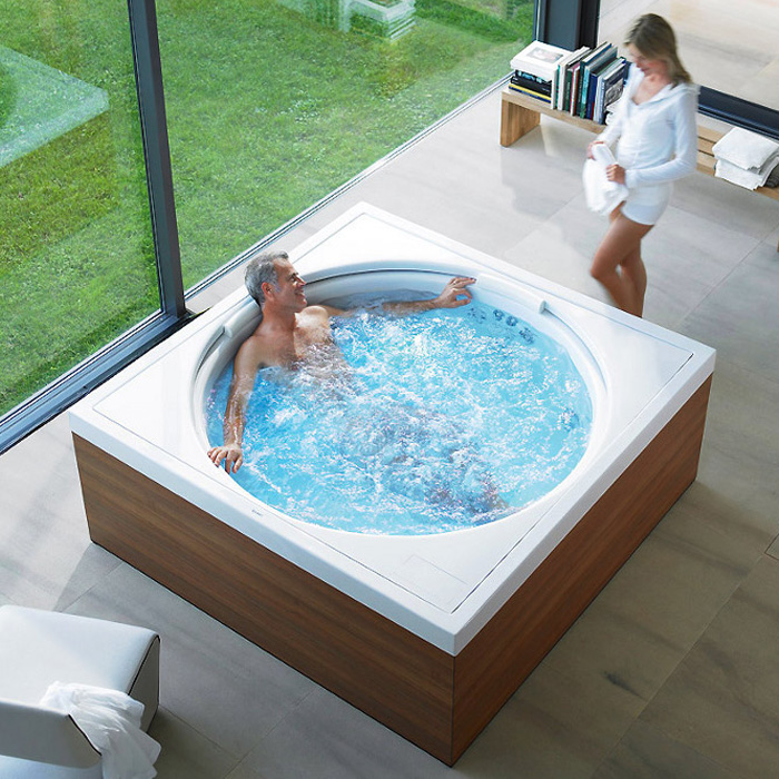Duravit Blue Moon - оригінальне дизайнерське твір Jochen Schmiddem, своїм квадратним корпусом і круглої чашею гідромасажна ванна Blue Moon виглядає як маленький басейн. Чудово підходить також для установки в зимовому саду або на терасі.
