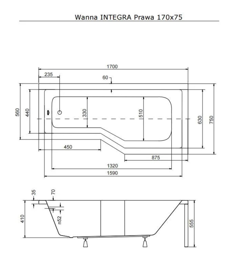 Ванна акрилова INTEGRA 170х75 Права (соло) без ніг