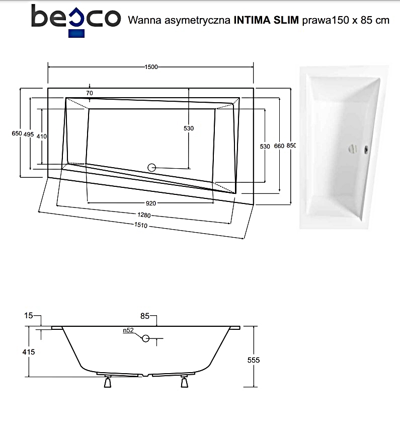 Ванна акрилова INTIMA SLIM 150х85 Права (соло) без ніг