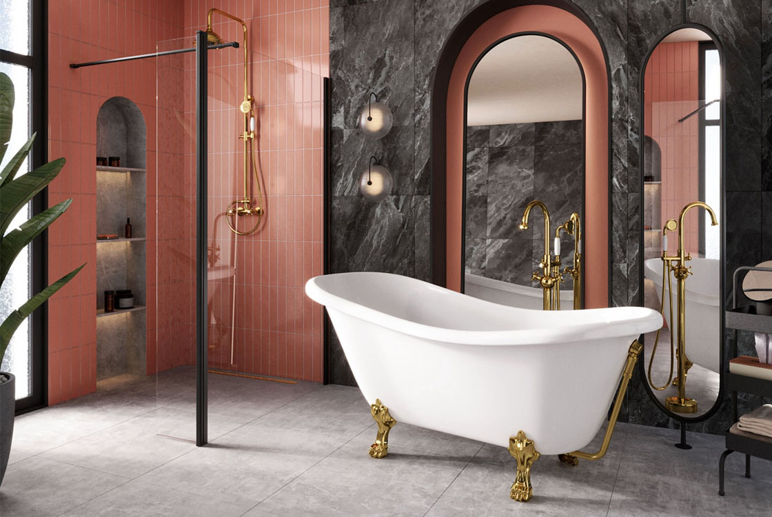 Ванна OTYLIA в ретростилі, вільностояча білого кольору зі золотими ногами.