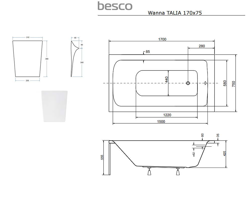 Відгуки про "Ванна акрилова TALIA 170х75 Premium (підголовник+ручки) без ніг / без обудови"