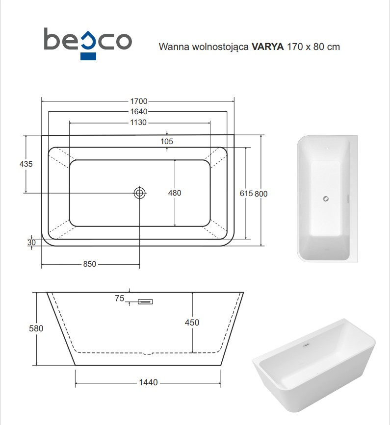 Акрилова ванна VARYA в комлекті з сифоном в білому кольорі.