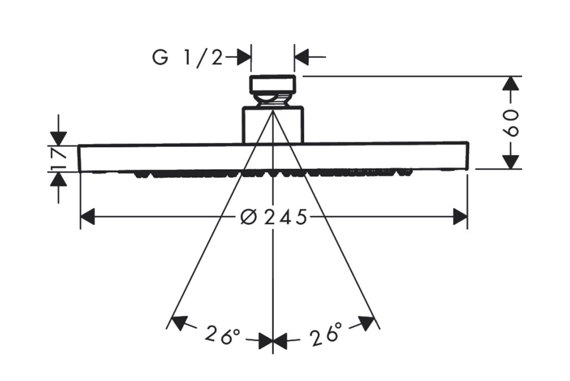 Axor розмір душової лійки: 245 мм,тип розпилення: Дощ,матеріал розпилювального диска: метал,монтаж: стеля, стіна,кульовий шарнір: верхній душ регулюється кутом нахилу,максимальна витрата води при 3 барах: 10,1 л/хв,необхідне додаткове обладнання: стельовий або стіновий кронштейн (не входить в комплект).
