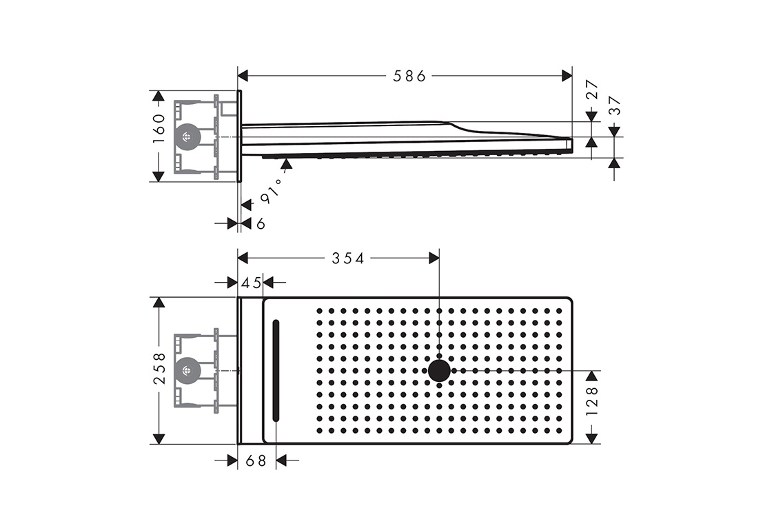 Axor складається з: верхнього душу, настінного кріплення,розмір душової лійки: 586х258 мм,тип розпилення: Rain, RainFlow, Mono,матеріал розпилювального диска: метал,максимальна витрата при 3 барах: 20 л/хв,мінімальний тиск потоку: 1,7 бар,розпилювальний диск знімний для очищення,монтаж: настінний,приєднувальний розмір: DN15,тип підключення: базовий комплект,підходить для проточних водонагрівачів.необхідне додаткове обладнання: прихована частина для змішувачів Ibox universal (арт.01700180) (не входить в комплект).