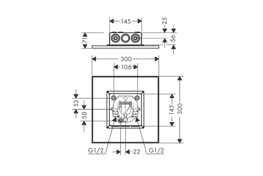 Axor розмір душової лійки: 300х300 мм,тип розпилення: PowderRain, Intense PowderRain,матеріал розпилювального диска: метал,максимальна витрата при 3 барах: 17 л/хв.необхідне додаткове обладнання: прихована частина для монтажу душу зі стелі (арт.35363180) (не входить в комплект).
