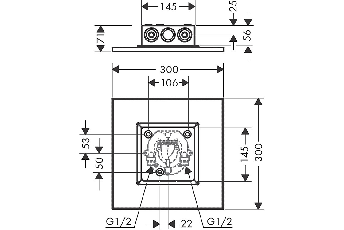 Axor розмір душової лійки: 300х300 мм,тип розпилення: PowderRain,матеріал розпилювального диска: метал,максимальна витрата при 3 барах: 18,1,необхідне додаткове обладнання: прихована частина для монтажу душу зі стелі (арт.35363180) (не входить в комплект).