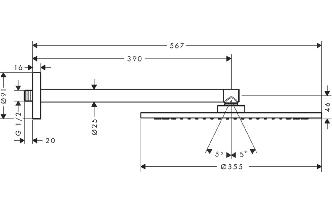 Axor складається з: верхнього душу, тримача,розмір душової лійки: 350 мм,тип розпилення: PowderRain,максимальна витрата при 3 барах: 26 л/хв.