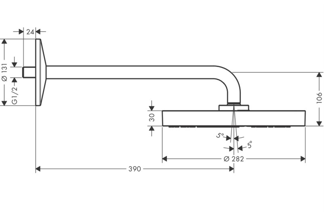 Axor складається з: верхнього душу, стінового кронштейна,розмір душової лійки: 280 мм,тип розпилення: PowderRain і Rain в комбінації,кульовий шарнір: верхній душ регулюється кутом нахилу,довжина душового кронштейну 390 мм,максимальна витрата води при 3 барах: 12,3 л/хв.