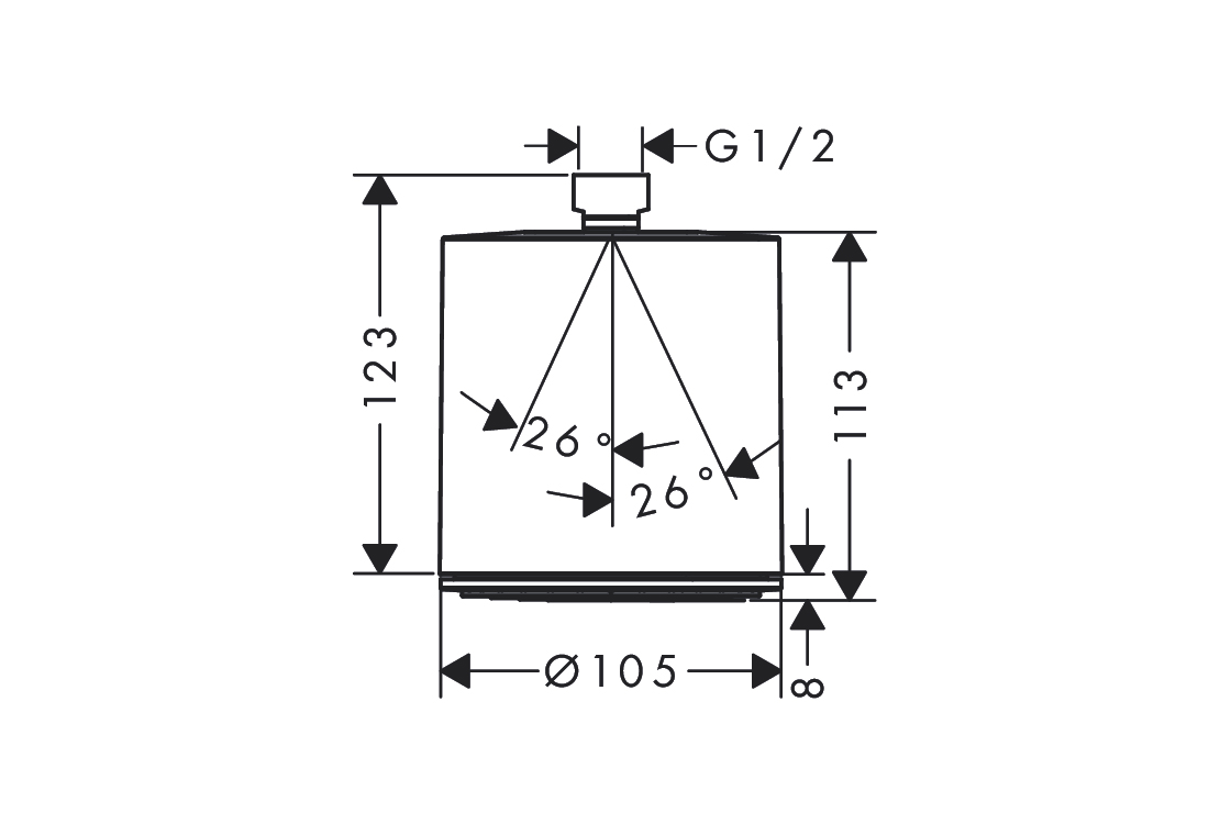 HANSGROHE розмір душової лійки: 105 мм,тип розпилення: PowderRain,кульовий шарнір: верхній душ регулюється кутом нахилу,матеріал розпилювального диска: пластик,максимальна витрата при 3 барах: 11,7 л/хв,мінімальний тиск потоку: 0,8 бар,з'єднувальна різьба G ½,приєднувальний розмір: DN15,підходить для проточних водонагрівачів.
