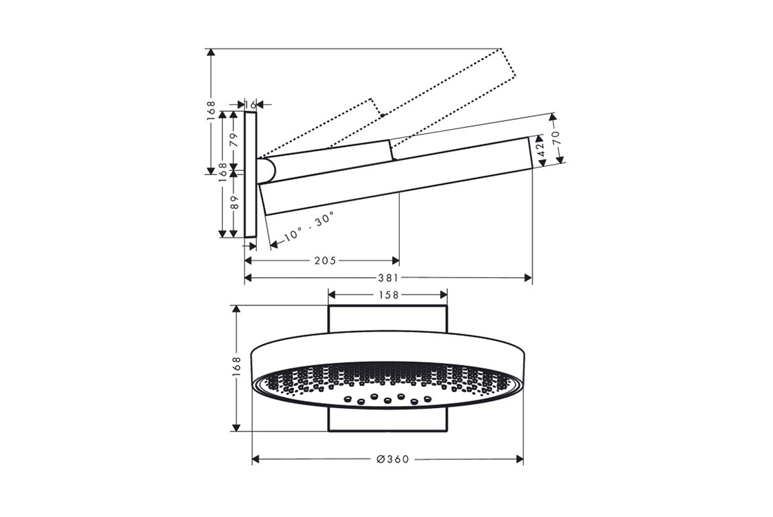 HANSGROHE складається з: верхнього душу, настінного тримачарозмір душової лійки: 360 мм,тип розпилення: PowderRain, Intense PowderRain, RainStream,виступ 381 мм,середній розпилювальний диск: 205 мм,каркас: метал,матеріал розпилювального диска: алюміній,поверхня розпилювального диска: графіт,душова лійка з вертикальним нахилом на 10-30°,максимальна витрата при 3 барах: 28,1 л/хв,витрата спрею PowderRain (при 3 барах): 20 л/хв,витрата Intense PowderRain (при 3 барах): 18 л/хв,витрата спрею RainStream (при 3 барах): 16 л/хв,функція від: 12,2 л/хв,мінімальний тиск потоку: 1,7 бар,3 зони розпилення повинні контролюватися за допомогою 3-ох клапанів або перекидного клапана з 3-ма вихідними отворами,верхній душ знімається для очищення,приєднувальний розмір: DN15,не підходить для безперервних проточних водонагрівачів,необхідне додаткове обладнання: прихована частина для змішувачів Ibox universal (01800180) (не входить в комплект).