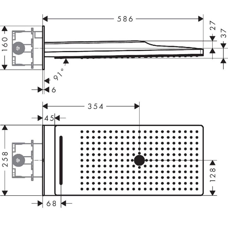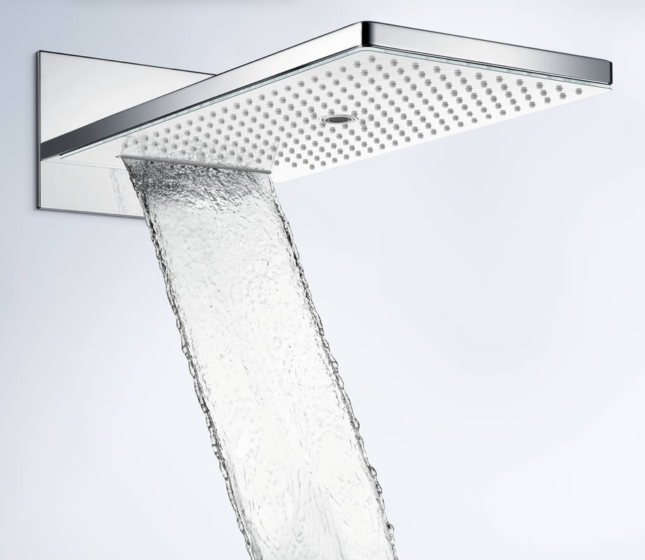 HANSGROHE 3 типи струменів: Rain, Rainflow Waterfall, Mono. Витрати води для струменя Rain (при 3 бар): 17 л/хв, для Mono (при 3 бар): 20 л/хв, для Rainflow Waterfall (при 3 бар): 18 л/хв. Душовий диск покритий безпечним склом, він знімається для зручної очистки. Монтується на стіну за допомогою прихованого монтажу iBox.