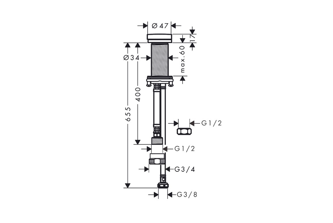 приєднувальний розмір: G ½ разом з адаптером G ¾,діапазон затиску: 0 - 60 мм,діаметр отвору: 35 мм,діаметр: 48,0 мм,для установки в кухонні мийки і стільниці.