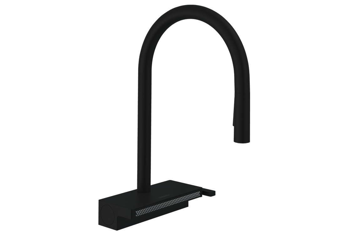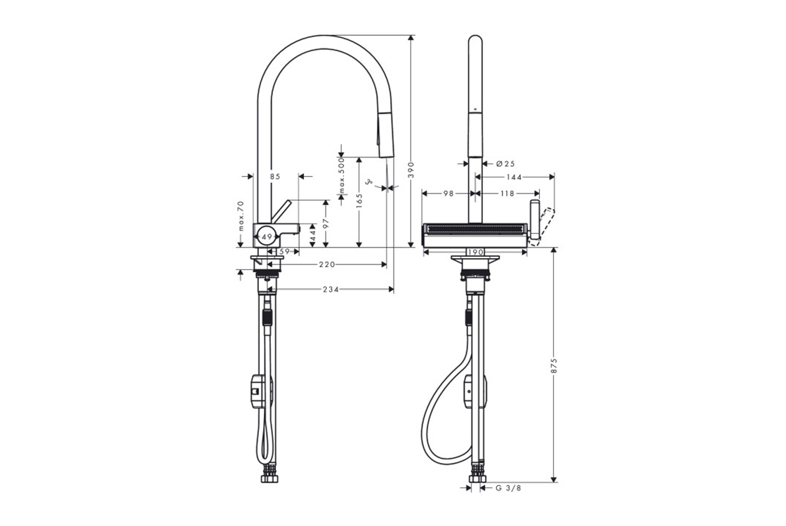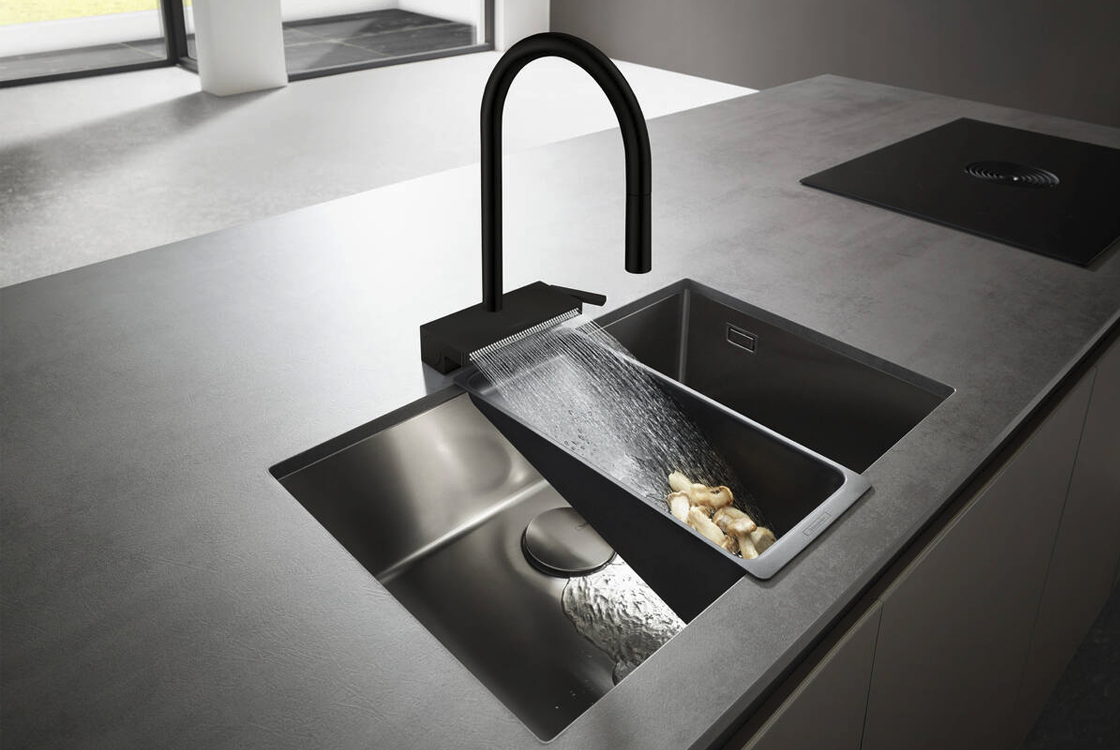 складається з: одноважільного кухонного змішувача, багатофункціонального ситечкаComfortZone 170,діапазон повороту регулюється в 3 кроки 60°, 110° або 150°,ламінарний спрей, душовий спрей, SatinFlow,перемикається між SatinFlow і висувним спреєм одним натисканням кнопки,магнітна підставка для душу MagFit,приєднувальний розмір: DN15,максимальна витрата при 3 барах: 7 л/хв,керамічний картридж,тип з'єднання: G ⅜,вбудований зворотний клапан,не підходить для безперервних проточних водонагрівачів,довжина розширення до 50 см,потрібний отвір під кран Ø 35 мм, рекомендація: середина отвору під кран має бути макс. 50 мм від задньої сторони чаші,