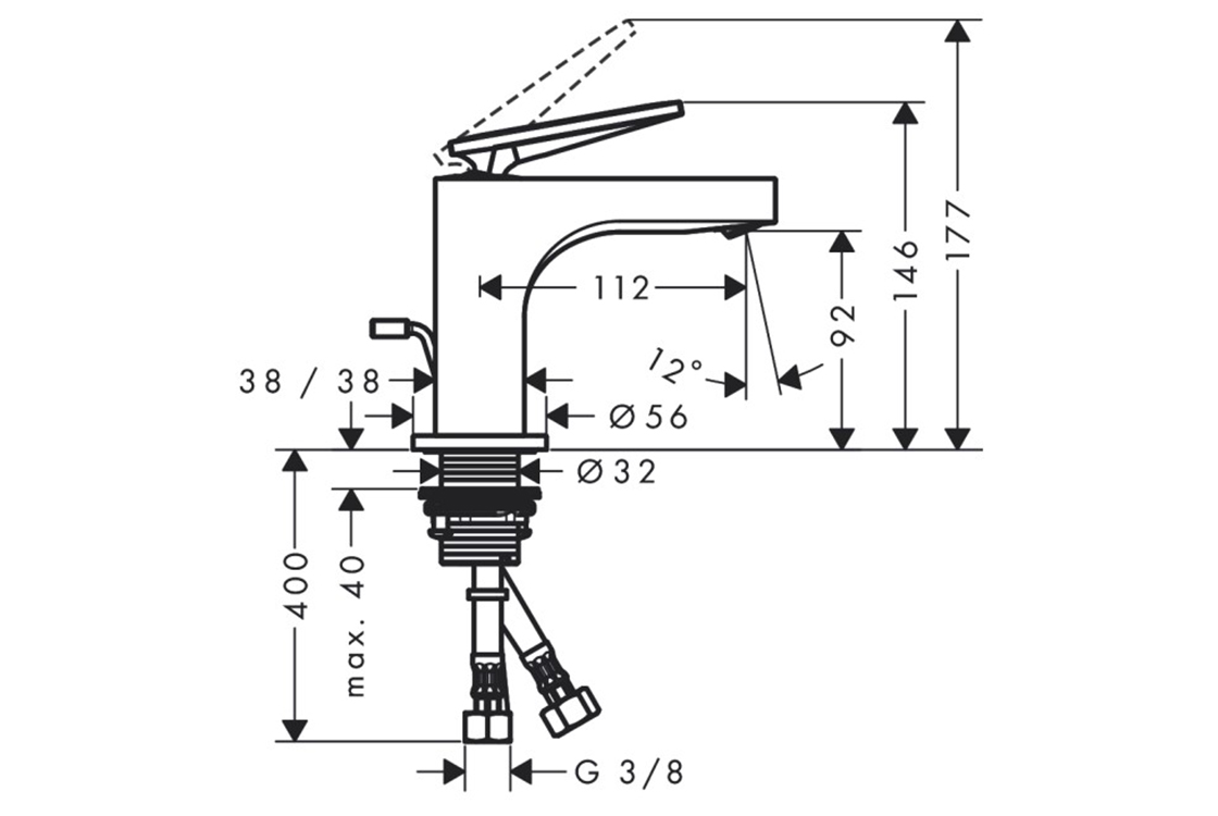 складається з: одноважільного змішувача для умивальника, зливного комплекту,поверхня важеля з ромбічним тисненням,проекція: 112 мм,висота носика: 92 мм,тип розпилення: ламінарне розпилення,поворотний розпилювач,максимальна витрата при 3 барах: 5 л/хв.