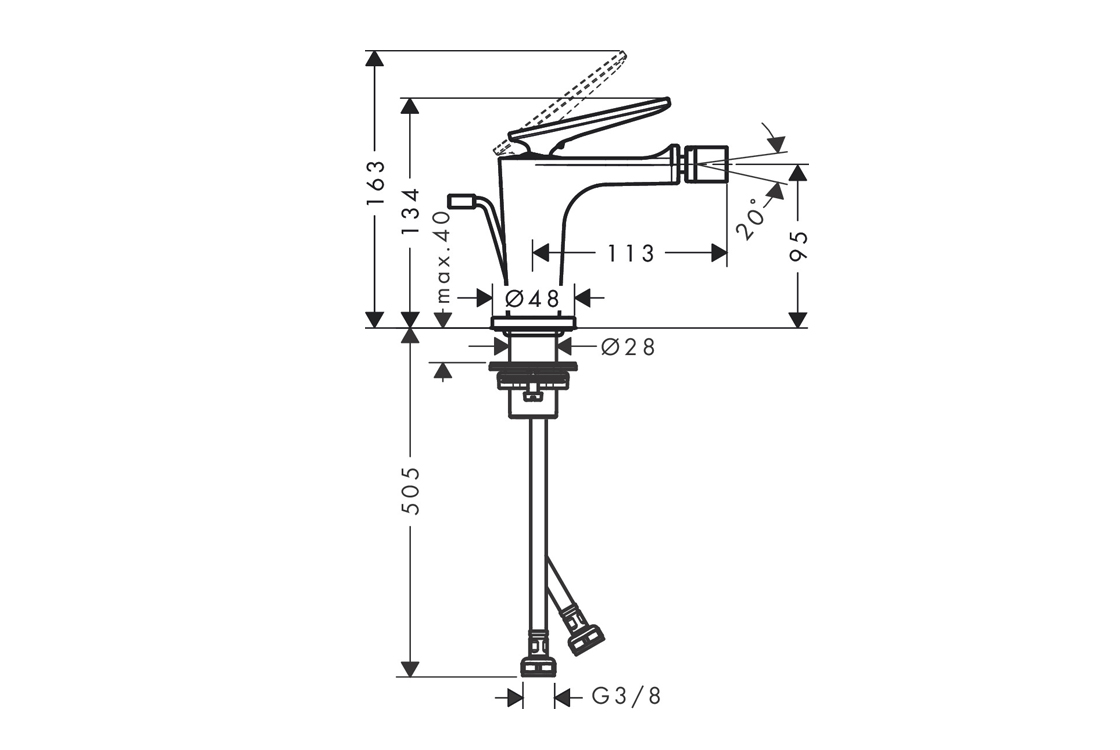 складається з: одноважільного змішувача для біде, зливного комплектувиступ: 113 мм;висота носика: 95 мм;кульовий шарнір;тип розпилення: ламінарне розпилення;максимальна витрата при 3 барах: 7,5 л/хв;керамічний картридж;підходить для проточних водонагрівачів;висувний донний клапан G 1¼;тип з'єднання: з'єднання G ⅜;приєднувальний розмір: DN15