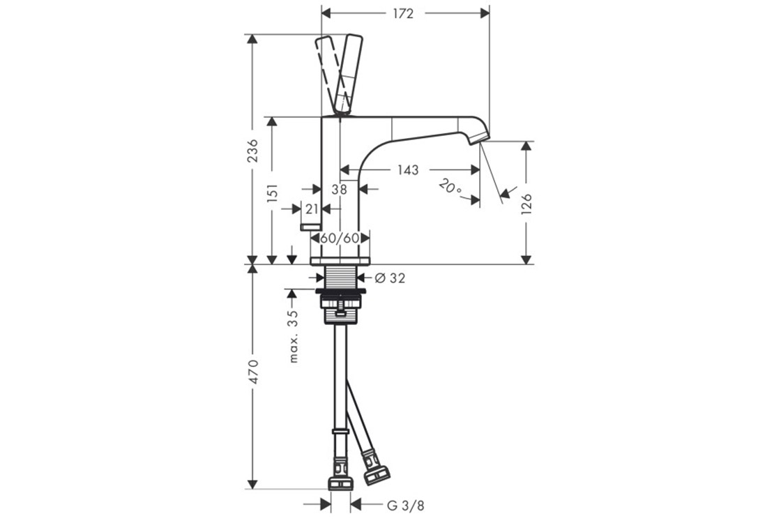 складається з: одноважільного змішувача для раковини, зливного комплекту,виступ: 143 мм,ComfortZone 130,висота носика: 126 мм,тип розпилення: ламінарне розпилення,максимальна витрата води при 3 барах: 5 л/хв.