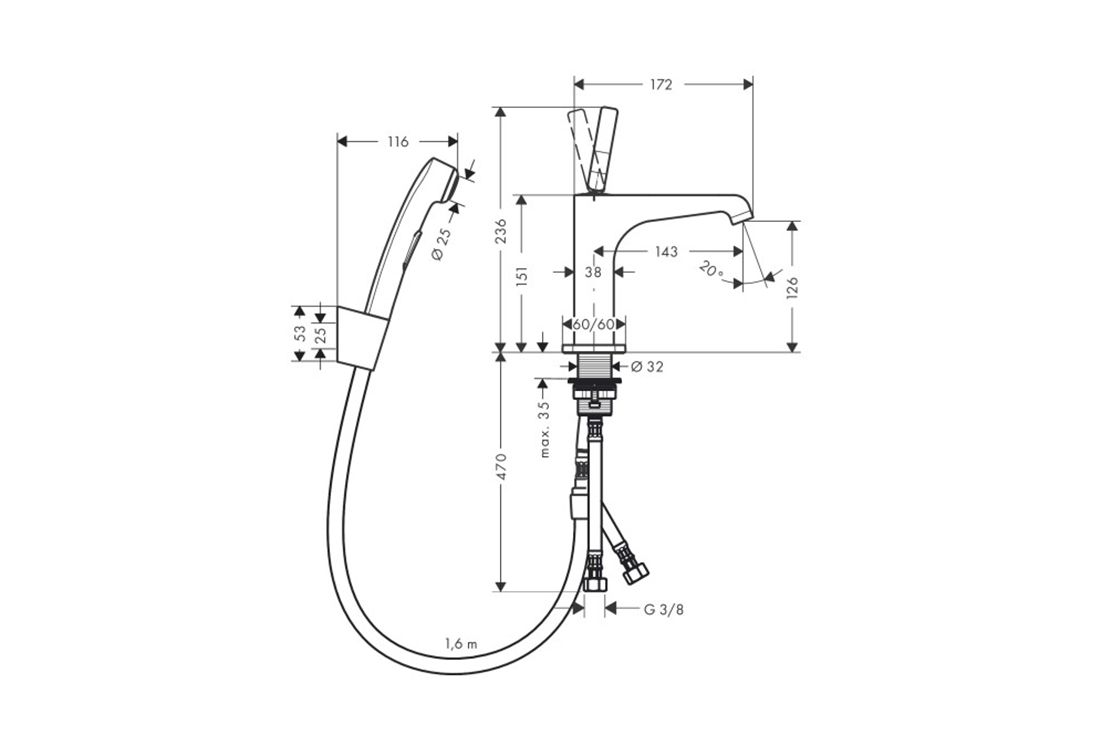 складається з: одноважільного змішувача для раковини, ручного душу-біде, тримача для душу, душового шланга, зливного набору,ComfortZone 130,виступ: 143 мм,висота носика: 126 мм,тип спрею: звичайний спрей,максимальна витрата при 3 бар: 5 л/хв,зливний набір Push-Open G 1¼.