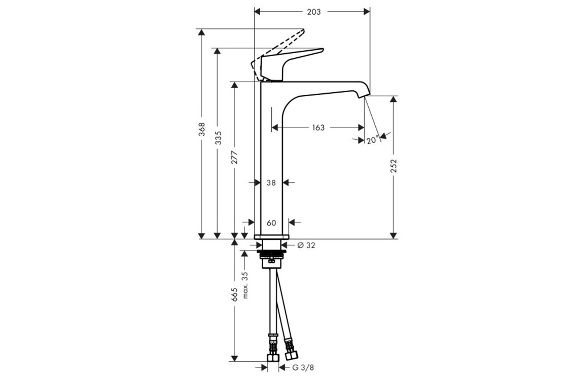 складається з: одноважільного змішувача для раковини, зливного комплекту,ComfortZone 250,виступ: 163 мм,висота носика: 252 мм,тип розпилення: ламінарне розпилення,тип з'єднання: з'єднання G ⅜,максимальна витрата при 3 барах: 5 л/хв.