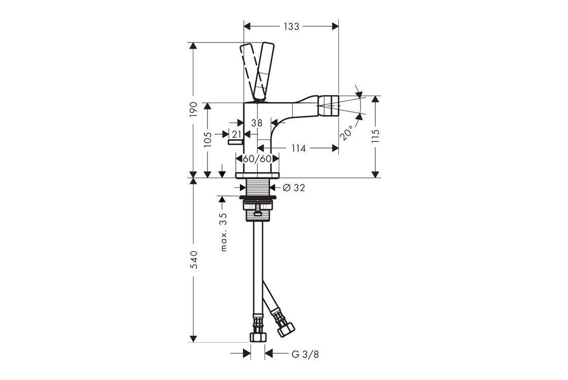 складається з: одноважільного змішувача для біде зі штифтовою ручкою, зливного комплекту pop-upвиступ: 114 мм,висота носика: 105 мм,аератор з кульковим шарніром,тип спрею: звичайний спрей,максимальна витрата при 3 барах: 7,2 л/хв,керамічний картридж,підходить для проточних водонагрівачів,тип з'єднання: G ⅜,приєднувальний розмір: DN15.