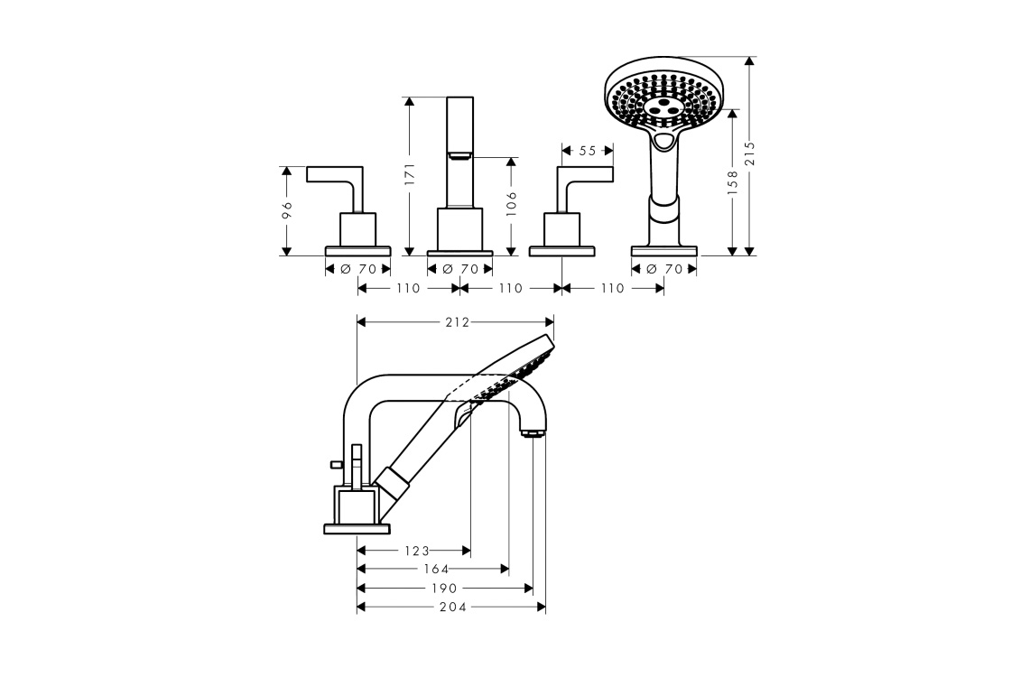 складається з: змішувача для ванни на 4 отвори, ручного душу, душового шланга, тримача для душу2 функції;проекція: 190 мм;тип розпилювача змішувача: звичайний розпилювач;тип розпилювача ручного душу: Rain, RainAir, WhirlAir;максимальна довжина висувного ручного душа: 1,10 м;максимальна витрата при 3 барах: 21 л/хв;витрата виливу для ванни при 3 барах: 21 л/хв;витрата ручного душу при 3 барах: 18 л/хв;керамічні клапани гарячий/холодний 90°;дивертер з автоматичним скиданням;зворотний клапан;приєднувальний розмір: DN15;тип підключення: базовий комплект;установка на бортик ванни;хв. робочий тиск: 1 бар;макс. робочий тиск: 10 бар;необхідне додаткове обладнання: прихована частина для змішувача на ванну 4 отвори (арт.15480180) (не входить в комплект).