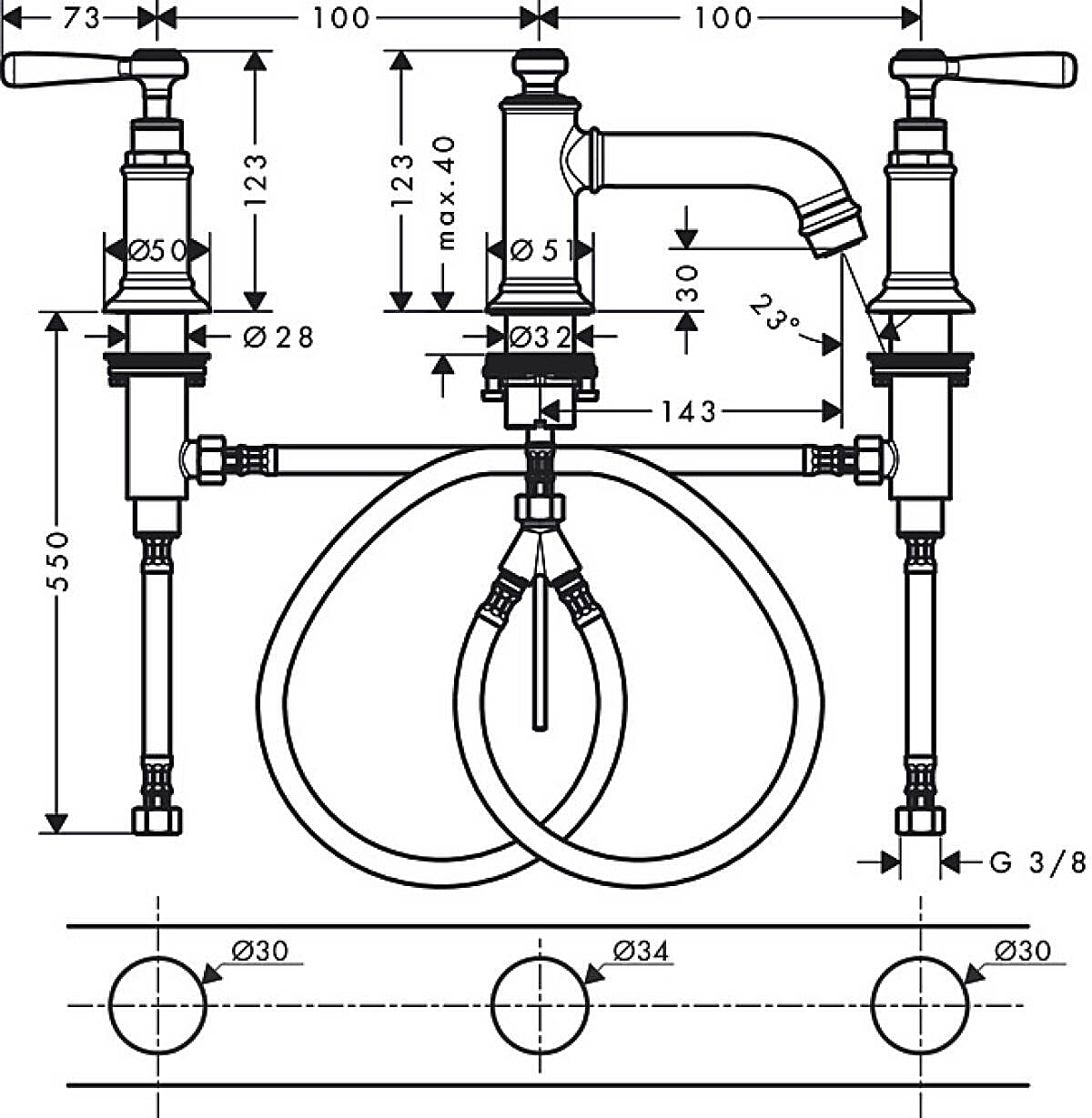 Змішувач Axor Montreux 30 для умивальника на 3 отвори ручки Lever, хром 16535000