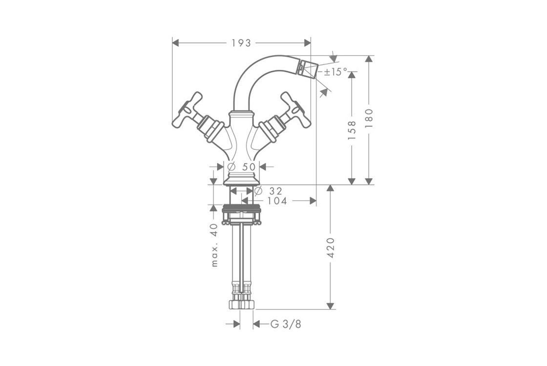 складається з: двохвентильного змішувача для біде, зливного комплекту,виступ 104 мм,висота носика: 158 мм,кульовий шарнір,тип розпилення: ламінарне розпилення,максимальна витрата при 3 бар: 7,5 л/хв,керамічні клапани гарячий/холодний 180°,тип з'єднання: з'єднання G ⅜.