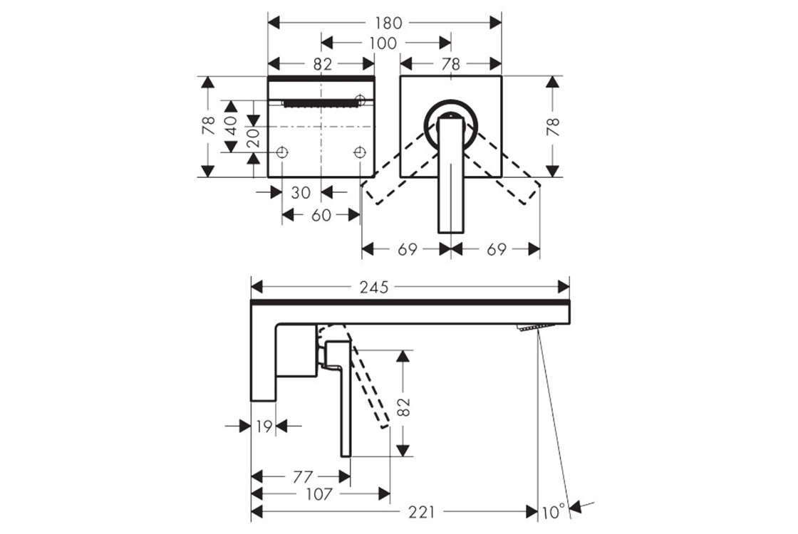 складається з: одноважільний змішувач для умивальника прихованого монтажу настінний, зливний комплект,проекція: 221 мм,максимальна витрата при 3 барах: 5 л/хв,необхідне додаткове обладнання: прихована частина для змішувача зі стіни (арт.13623180) та накладка для змішувача MyEdition 245 (не входять в комплект).