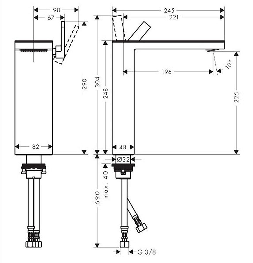 складається з: одноважільного змішувача для раковини, зливного комплекту,проекція: 196 мм,висота носика: 225 мм,максимальна витрата при 3 барах: 5 л/хв,необхідне додаткове обладнання: накладка для змішувача MyEdition 245 (не входить в комплект).