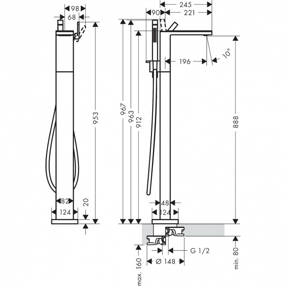 складається з: одноважільного змішувача для ванни підлогового типу, ручного душу, душового шланга, тримача для душу2 функції,проекція: 196 мм,тип розпилення змішувача: звичайний розпилювач,тип розпилення ручного душу: Rain, Mono,максимальна витрата при 3 барах: 20 л/хв,витрата виливу для ванни при 3 барах: 20 л/хв,витрата ручного душу при 3 барах: 13 л/хв,керамічний картридж,регулюється обмеження температури,дивертер з автоматичним скиданням,зворотний клапан,приєднувальний розмір: DN15,тип підключення: базовий комплект,хв. робочий тиск: 1 бар,макс. робочий тиск: 10 барнеобхідне додаткове обладнання: прихована частина для підлогового змішувача (10452180) та накладка MyEdition 245 (не входять в комплект).