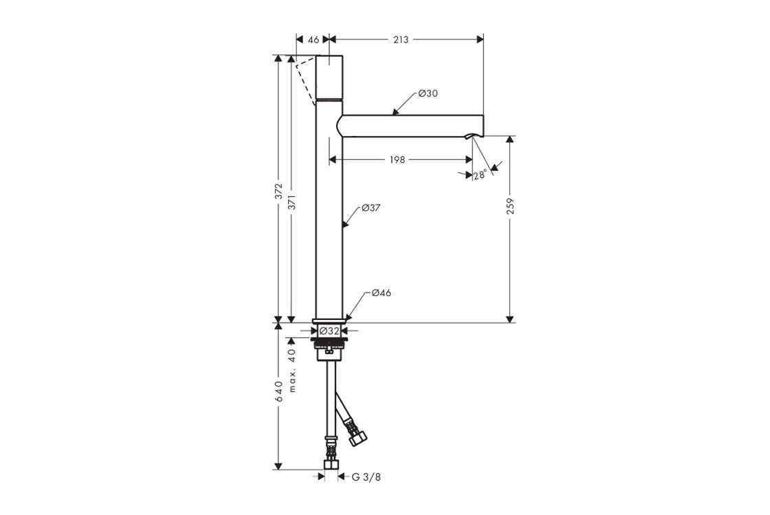 складається з: одноважільного змішувача для умивальника, зливного комплектуComfortZone 260;проекція: 198 мм;висота носика: 259 мм;варіант ручки: циліндрична ручка;тип розпилення: ламінарне розпилення;максимальна витрата при 3 барах: 5 л/хв;керамічний картридж;регулюється обмеження температури;підходить для безперервних проточних водонагрівачів;донний клапан з фіксованою кришкою;тип з'єднання: з'єднання G ⅜;приєднувальний розмір: DN15