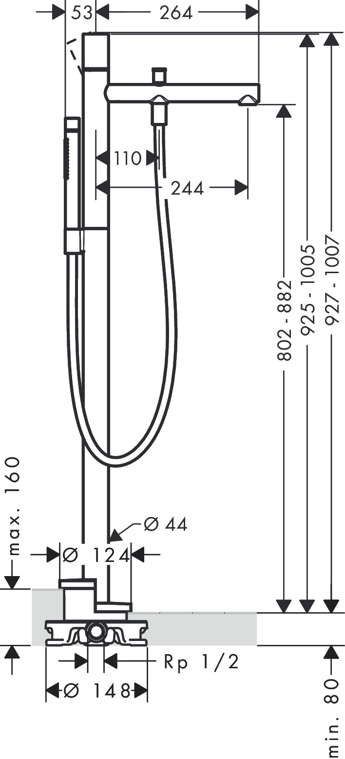 складається з одноважільного підлогового змішувача для ванни, ручного душу-палочки, душового шланга, тримача для душу.виступ 244 мм.Тип підключення: базовий комплект.1 тип струменя: звичайний струмінь.Розпилювальний ручний душ: Rain, Mono.максимальна швидкість потоку при 3 барах: 18 л/хв.швидкість потоку для зливу ванни при тиску 3 барах: 18 л/хв.витрата ручного душу при 3 барах: 13 л/хв.мінімальний робочий тиск: 1 бар.максимальний робочий тиск: 10 бар.керамічний картридж.обмеження температури регулюється.дивертер з автоматичним скиданням.зворотний клапан.розмір підключення: DN15.Технології: AirPower (насичення потоку повітрям), QuickClean (легке очищення від вапняного нальоту).
