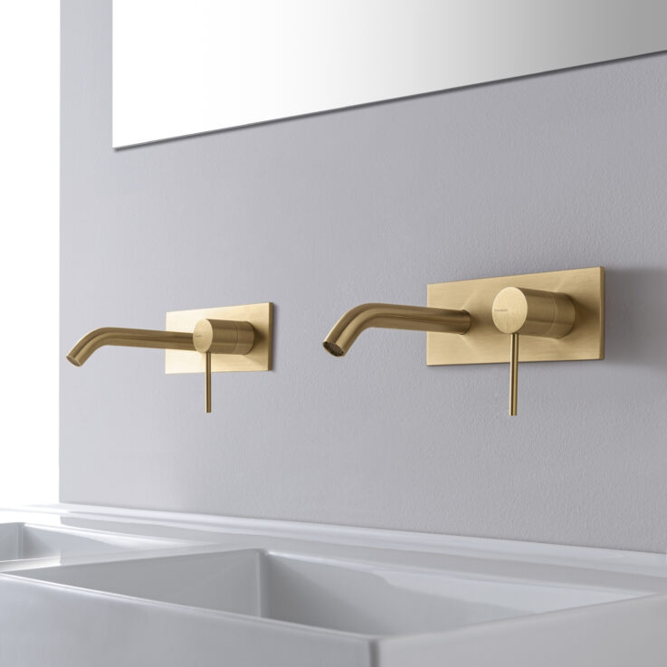 Змішувач для умивальника зі стіни Treemme 40 mm, вилив 15 см, зовнішня частина, Yellow gold PVD (RWIT 13A5 04 02) - такі терміни, як «біосумісність» і «енергозбереження», є невід'ємною частиною філософії компанії, яка прагне розробляти технологічно. , здатні захищати довкілля як під час виробництва, і під час використання.