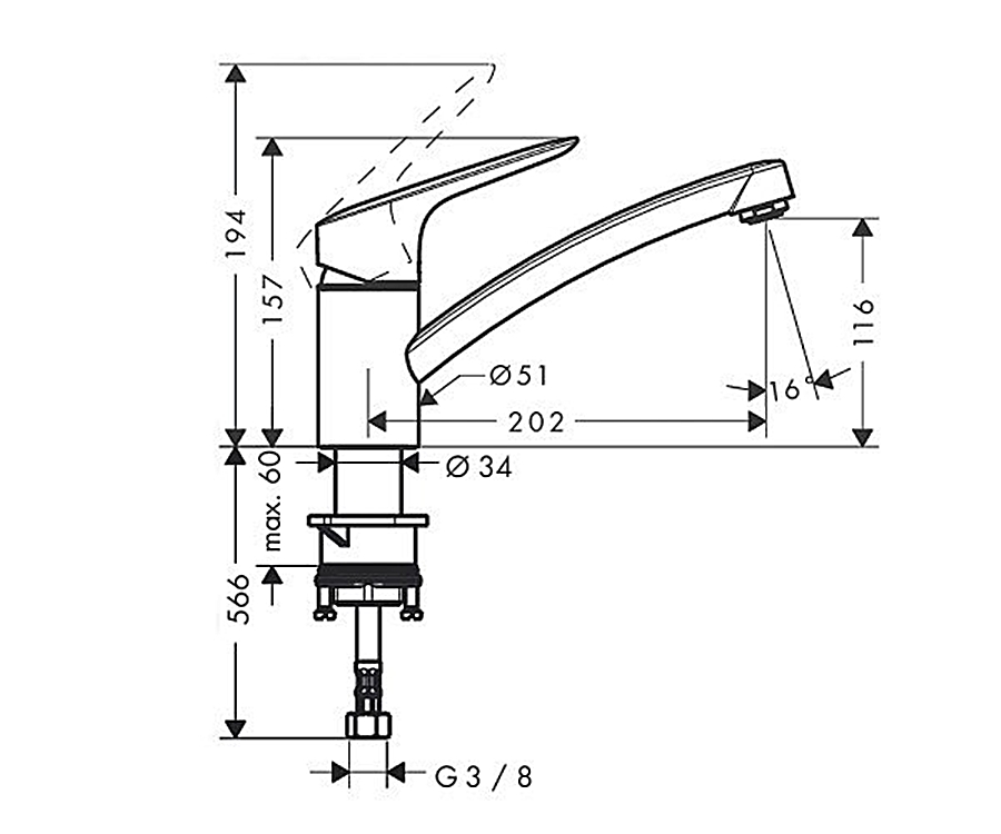 Діапазон повороту: 120° або 360°, регулюється в 2 положеннях. Максимальна витрата води при 3 барах: 11,1 л/хв.