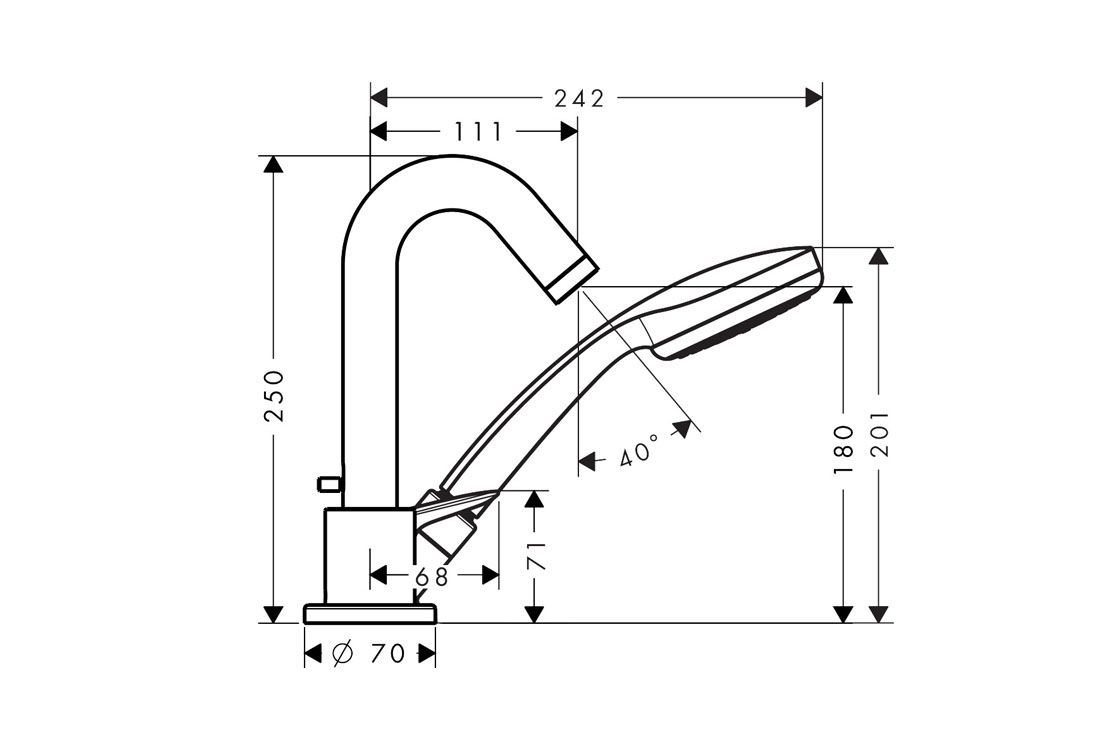 Одноважільний змішувач для ванни на 3 отвори для Secuflexскладається з: одноважільного змішувача для ванни на 3 отвори, ручного душу, тримача для душуРучний душ - тип струменя Rain (Дощ)максимальна довжина висувного ручного душа: 1,10 мкерамічний картриджрегулюється обмеження температури