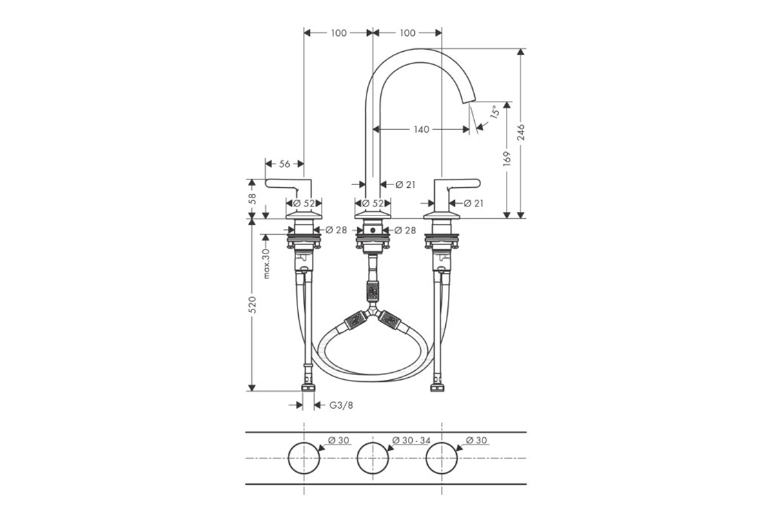 складається з: змішувача для умивальника на 3 отвори, зливного комплекту push-openComfortZone 170,виступ: 140 мм,висота носика: 169 мм,діапазон повороту 120°,тип спрею: звичайний спрей,максимальна витрата при 3 барах: 5 л/хв,керамічні клапани гарячий/холодний 90°,підходить для безперервних проточних водонагрівачів,зливний набір Push-Open G 1¼,тип з'єднання: з'єднання G ⅜,приєднувальний розмір: DN15.