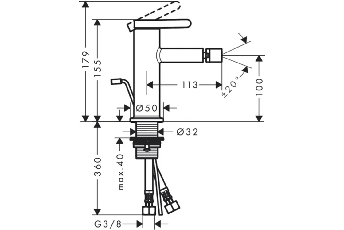складається з: одноважільного змішувача для біде, зливного комплекту pop-up,виступ 113 мм,висота носика: 100 мм,аератор з кульковим шарніром,тип спрею: звичайний спрей,максимальна витрата при 3 барах: 5 л/хв.