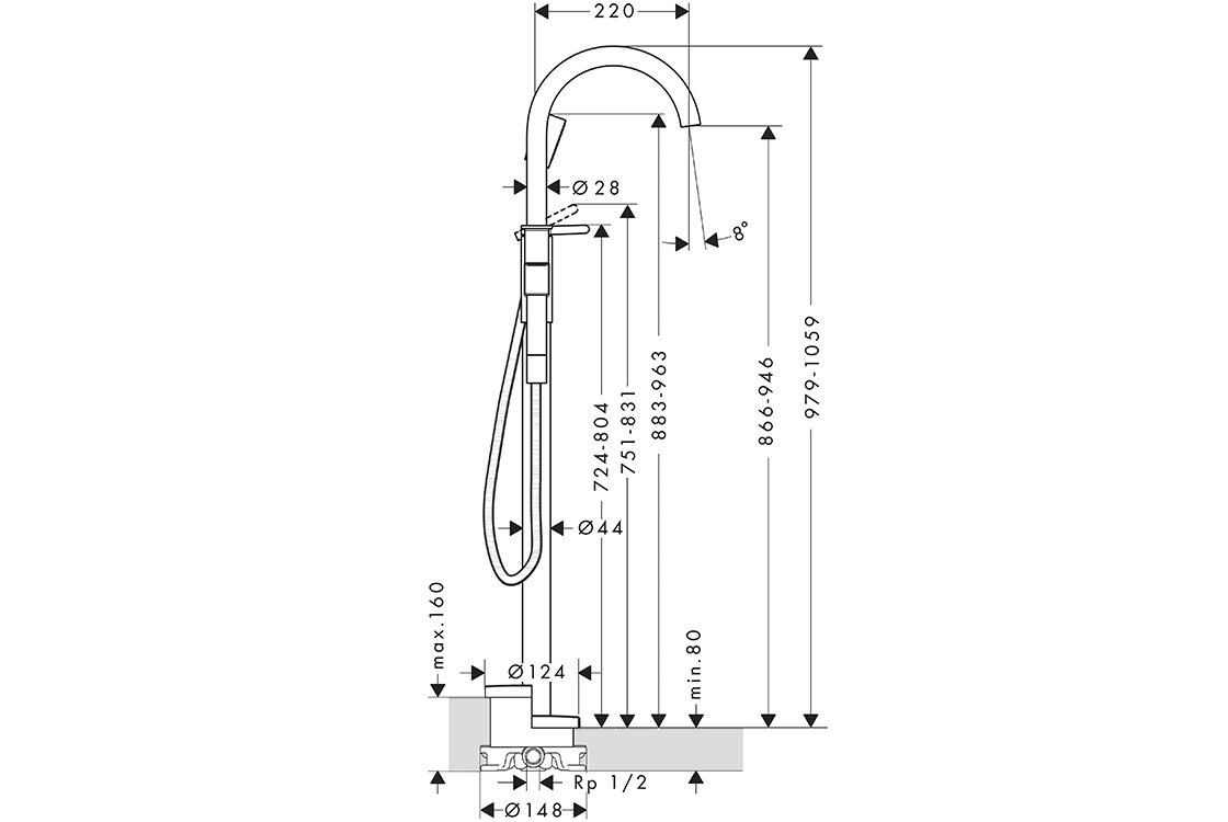 складається з: одноважільний змішувач для ванни підлоговий, ручний душ, душовий шланг, тримач для душу,виступ: 220 мм,максимальна витрата при 3 барах: 21,5 л/хв,необхідне додаткове обладнання: прихована частина для змішувача: підлоговий монтаж (арт.10452180) та ущільнювач для монтажу підлогового змішувача (арт.96441000).