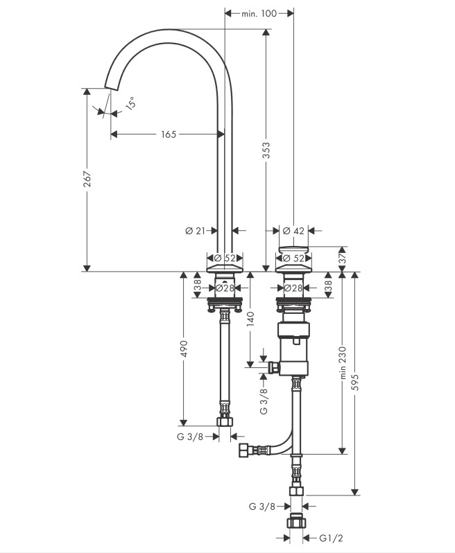 складається із: змішувача для умивальника на 2 отвори, зливного комплекту push-openComfortZone 260,проекція: 165 мм,висота носика: 267 мм,діапазон повороту 120°,тип спрею: звичайний спрей,максимальна витрата при 3 барах: 5 л/хв,регулюється обмеження температури,підходить для безперервних проточних водонагрівачів,зливний набір Push-Open G 1¼,тип з'єднання: з'єднання G ⅜,можливе гнучке розташування блоку управління та виливу.